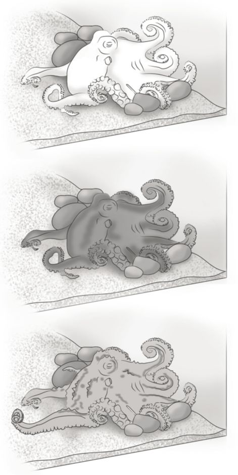 美国生物学家戴维·谢尔饲养了一只章鱼海蒂,他观察到了海蒂奇异的行为:海蒂起初平静地休息着,但是突然海蒂的皮肤从雪白一片变为闪烁的黄色,还带有橘黄色斑点——而这通常是它在醒着时看到一只螃蟹时的表现——然后海蒂又变成深紫色。谢尔解释说,“通常在成功捕杀之后,章鱼在离开海底时会这么做。” 再后来,海蒂的皮肤变成了一系列浅灰色和黄色,不过这次的颜色纵横交叉无序地分布在许多条状突起和尖角之上。“这是一种伪装,就像它刚刚抓到了一只螃蟹,正要坐下来大快朵颐,而不想让任何人注意到它。”引人注目的是海蒂的这种色彩变化模式和顺序总是和它在醒着捕食螃蟹时完全一样,这就不能用巧合来解释了。一个合理的解释是海蒂在做捕食梦。