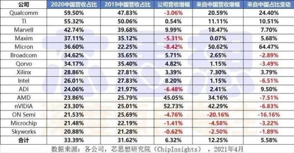 跨国公司 中文名称 2020中国营收占比Qualcomm 高通 59.50%TI 德州仪器 55.32%Marvell 美满科技 42.74%Maxim 美信公司 37.11%Micron 美光 36.60%Broadcom 博通 34.62%Qorvo 威讯联合半导体 34.17%Xilinx 赛灵思 28.86%Intel 英特尔 26.01%ADI 亚德诺半导体 24.06%AMD AMD 23.86%nVIDIA 英伟达 23.30%ON Semi 安森美半导体 21.53%Microchip 美国微芯 21.48%Skyworks 思佳迅半导体 20.88%平均水平 33.39%