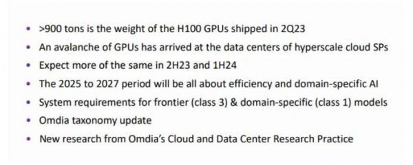 Omdia 估计,Nvidia 第二季度出货量超过 900 吨(180 万磅)用于人工智能 (AI) 和高性能计算 (HPC) 应用的 H100 计算 GPU。Omdia 认为,带有散热器的 Nvidia H100 计算 GPU 的平均重量超过 3 公斤(6.6 磅),因此 Nvidia 在第二季度出货了超过 30 万台 H100。