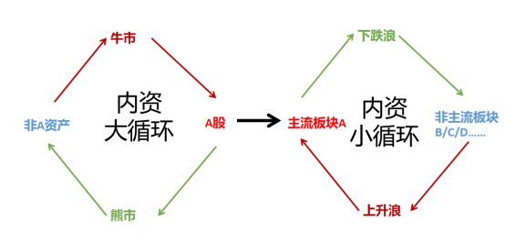 “内资小循环”的结果是大平台区间内的震荡,其动能是资金从一个板块挪到另一个板块,一种风格挪到另一种风格,其规律是: