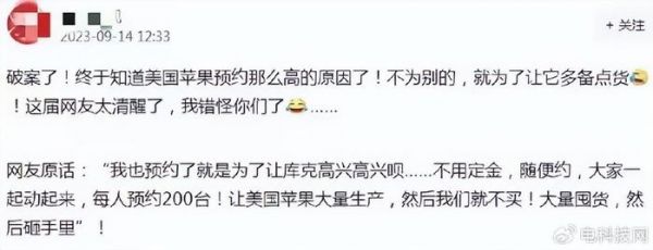 有意思的是,在网友们纷纷抢购iPhone 15系列的同时,也有不少人表示只是为了给苹果CEO库克一个面子,并不打算真正购买。有网友开玩笑说:“只预约不买,让库克高兴高兴”,让苹果备货之后卖不掉“砸手里”。