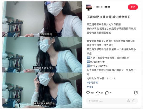 最近,以“发疯姐”为代表的韩国学习博主们在小红书等社交平台上走红,网友们甚至将这一类“玩命儿”式学习的韩国学习博主们统一用“韩女”来代称。提到学习博主界的“韩女精神”,指的就是那些卷到极致、疯狂学习的状态。