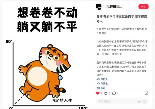 在“卷也卷不起、躺也躺不平”的大情绪中,学习博主们以“鸡血含量颇高”的视频内容和人设,确实给很多有上进焦虑的人注入了动力源,也让不少人得到了“代替满足”。