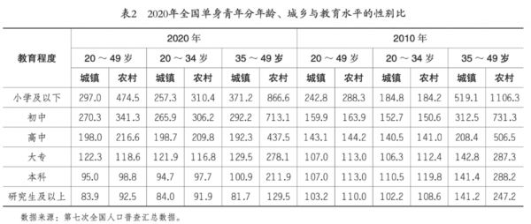 可以发现,“被动单身”与“主动选择”两大情境确实存在于当前的婚姻领域。首先,就“被动单身”而言,婚姻挤压的严重性与受教育程度呈反比。最严重的婚姻挤压发生在小学及以下学历的单身群体中,且相较2010年整体有所恶化。就20~49岁的单身青年而言,城乡性别比分别从2010年的242.8与288.3上升到了2020年的297.0与474.5,性别失衡情况加剧。与此同时,高中及以下学历单身青年婚配竞争提前,20~34岁的性别比较10年前进一步提升。相较于城镇青年,婚姻挤压在农村的形势更为严峻。