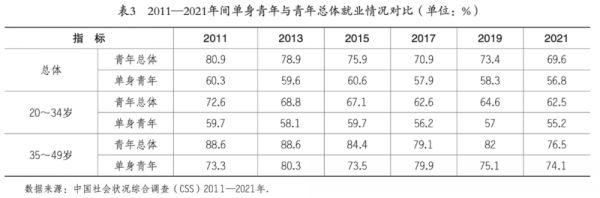 表3展现了自2011年以来,不同年龄段青年总体与单身青年的就业情况对比。可以发现,受就业形势与择业观念的影响,单身青年与青年总体在十年间都经历了就业率的整体下降。