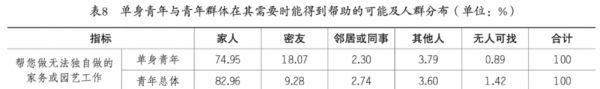 另一方面,家人仍然是单身青年重要甚至是不可或缺的支持来源。在个体最为脆弱的时候,如生病卧床或无法独立完成家务事项时,家人依然是87.64%与74.95%的单身青年最可能得到帮助的来源。