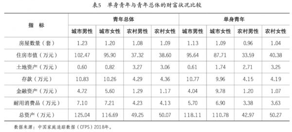 相较于西方社会,中国家庭更偏好无风险性资产,房产更是占决定性主导。第三,单身青年内部的财富由高到低排序情况依次为城市男性、城市女性、农村女性与农村男性。相较而言,单身农村男性的财富状况同比最低,凸显了其相对劣势的经济境况。