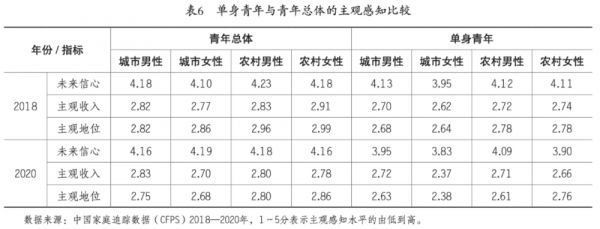首先,就历时维度而言,青年总体的主观感知均有一定下滑,且单身青年对未来预期的下降更为明显,尤其体现在城市单身青年的身上。其次,就截面维度而言,单身青年在各个维度上的得分都低于青年总体,体现出单身青年相对弱势的自我感知。在单身青年内部,女性相较于男性、城镇居民相较于农村居民均呈现了更低的未来信心与主观感知。