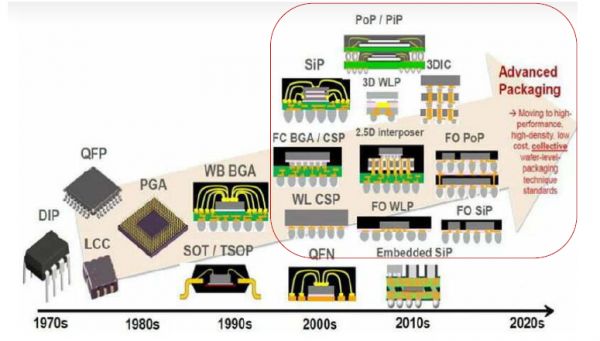 过去70年,封装行业至少经历了四次大的技术变革。尤其是从2010s开始,行业逐渐进入到先进封装的新发展阶段(2010年,蒋尚义先生提出通过半导体公司连接多颗芯片的方法,区别于传统封装,定义为先进封装)。自此之后,新的概念也开始层出不穷,比如有FC、SiP、2.5D封装、3D封装、FO、RDL、TSV等等。
