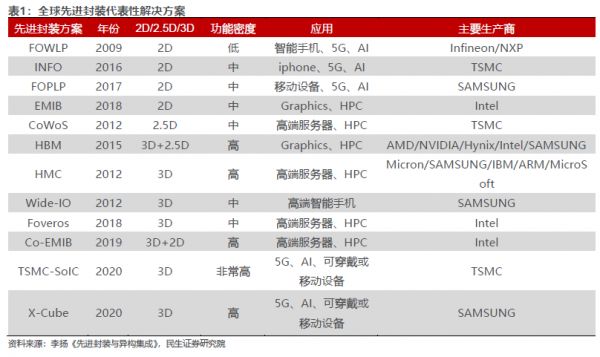 图:全球先进封装代表性解决方案;资料来源:民生证券。