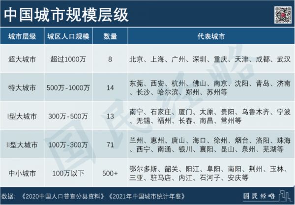 城区人口超过1000万的为超大城市,500万以上的为特大城市,300万~500万的为I型大城市,100万~300万的为II型大城市,100万以下的为中小城市。