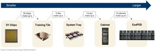 Dojo基于特斯拉自行设计、台积电7nm工艺代工的D1芯片组成。其没有采用通常的集中式服务器中心架构,而是高度可扩展性、具备 1.1 exaflops峰值算力的计算集群“ExaPOD”。