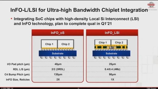 2021年8月,台积电更新封装路线图,亮相了面向超高带宽chiplet(芯粒)集成InFO-L/LSI(整合型扇出封装技术中的一个分支)多个die下方有个“本地硅互联”层,并附上了一个特斯拉AI芯片的参考链接。