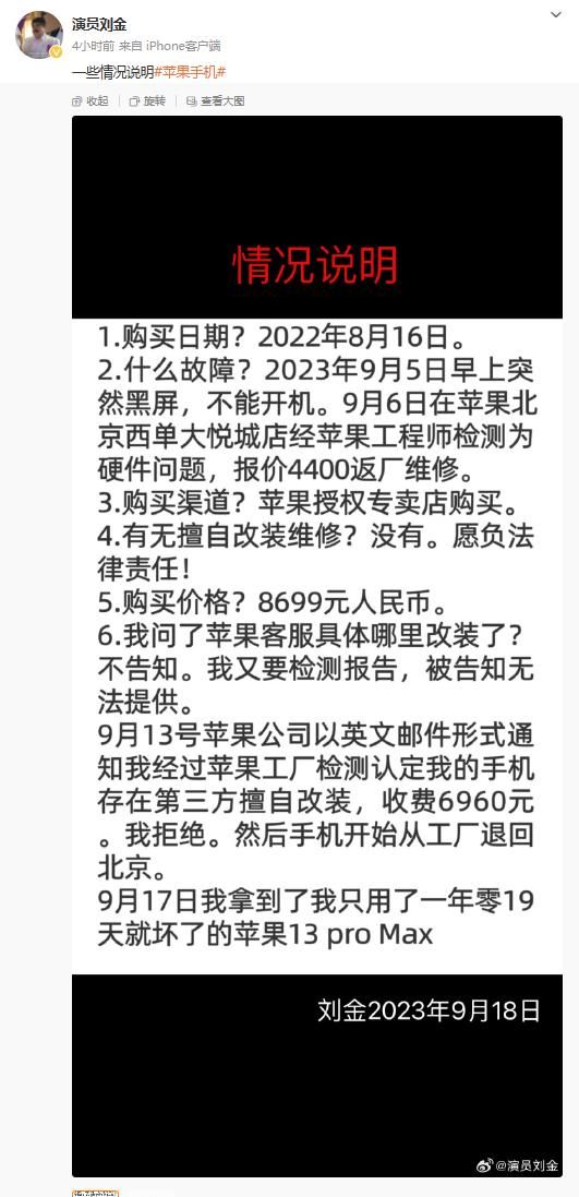 根据演员刘金的声明,他在 2022 年 8 月 16 日从苹果授权专卖店购买了一部 iPhone 13 Pro Max 手机,于 2023 年 9 月 5 日出现黑屏无法开机现象,期间没有擅自改装维修情况。