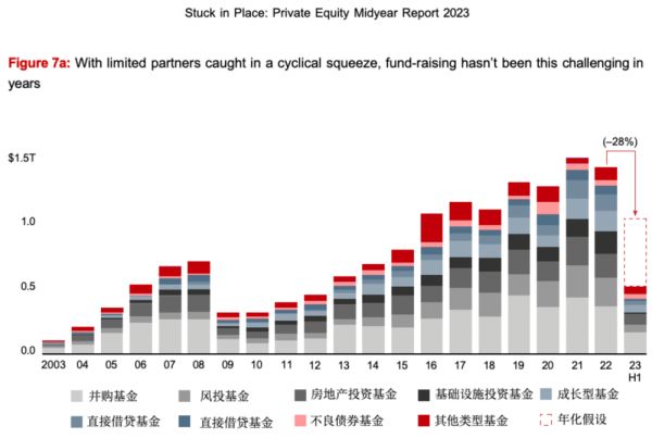 具体来看,全球的并购基金持有着创纪录的2.8万亿美元未退出资产,是2008年金融危机期间持有水平的四倍以上,这导致了LP的流动性紧缩,GP面临着巨大的筹资困境。根据Preqin的数据,截至2023年上半年结束,假设下半年继续维持上半年的趋势,全球私募市场募资金额将相比2022年下降28%,关账的私募基金数量将下降43%。