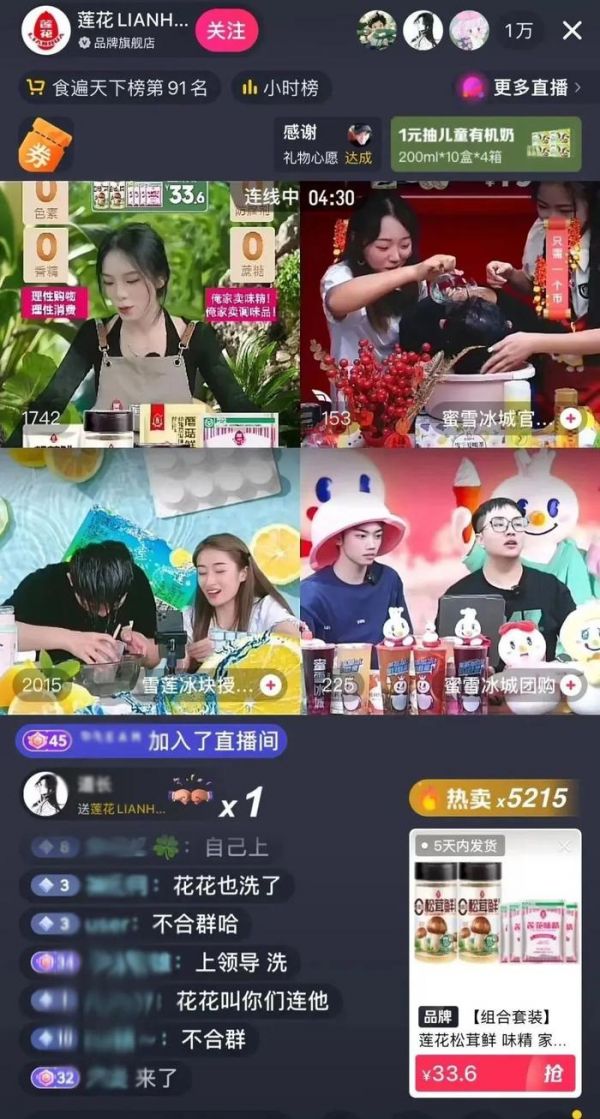 流量与热度主要源于9月12日。继蜂花后,莲花味精也迅速在官方店上架79元套餐,相关话题登上微博热搜,引发大量网友涌入直播间购买支持。当晚,直播间同时观看人数便涨至1000多人。