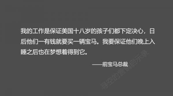 宝马美国的总裁曾说:“我的工作是保证美国十八岁的孩子们都下定决心,日后他们一有钱就要买一辆宝马。我要保证他们晚上入睡之后也在梦想着得到它。”