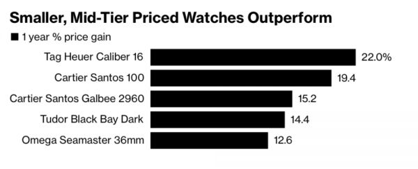 Subdial数据指出,包括泰格豪雅Caliber 16、卡地亚Santos 100、卡地亚Santos Galbee 2960、帝驼Black Bay Dark以及欧米茄Seamaster 36mm等小尺寸中档价位的腕表,在过去一年内的二手价格涨幅达12%至22%。