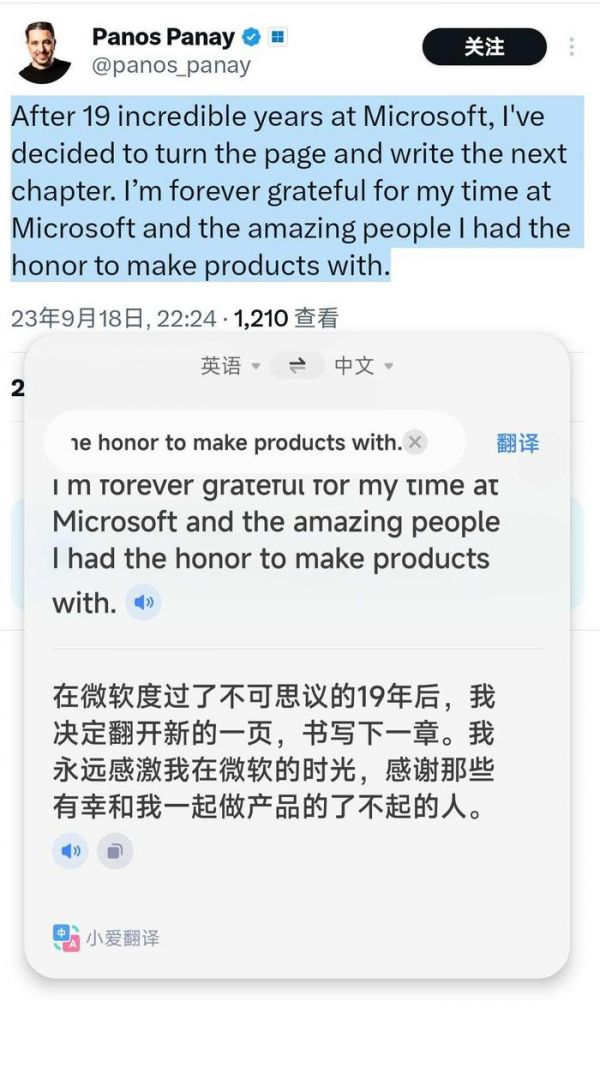 帕奈在推特称,“在微软度过了不可思议的 19 年后,我决定翻开新的一页,书写下一篇章。我永远感激我在微软的时光,感谢那些我有幸与之一起做产品的了不起的人。”