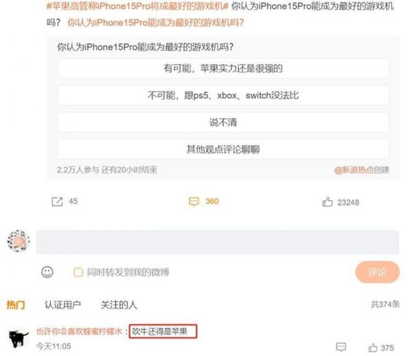 据了解,近日,苹果高管在接受采访时表示:”iPhone 15 Pro将成为最好的游戏机”,而对于该言论国内的网友似乎并不认可,甚至有网友表示“吹牛还得是苹果”,下方的网友对于该言论也是多是负面评论。