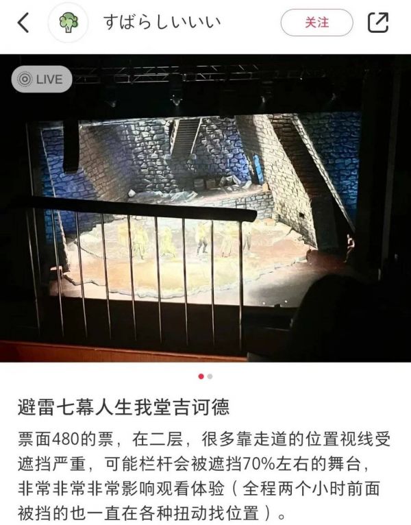 一位网友吐槽,自己花480元看音乐剧,却发现视野明显受到剧院围栏遮挡。(图/小红书@すばらしいいい)