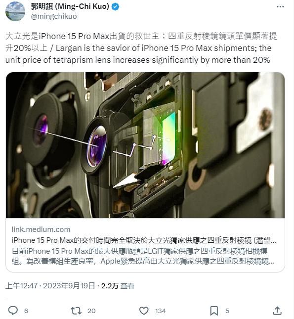郭明錤表示,由于这一变化,为了满足 iPhone 15 Pro Max 的强劲需求,大立光已经紧急扩大了四重反射棱镜镜头的生产线。
