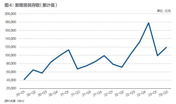 中国人民银行(下称“央行”)数据显示,2022年四季度,倾向更多储蓄的城镇储户占比61.80%,达到有统计以来峰值。2022年全年,全国居民部门人民币存款增长17.84万亿元;2023年上半年,居民存款继续增长11.91万亿元,其中一季度增长规模为9.9万亿元。