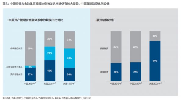 在刘冰冰看来,与欧美成熟市场相比,当前中国资管行业还处于早期行业发展阶段。据波士顿咨询测算,截至2021年,中国资产管理在金融体系中的规模占比为27%,而同期美国为42%。这意味着中国资管渗透率将来有望进一步提升,进而带动行业规模增长。