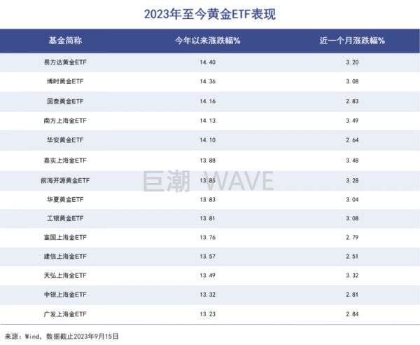 目前市场上有14只黄金主题ETF,主要通过投资黄金现货,跟踪国内黄金现货走势。截至9月15日,这些黄金ETF年内涨幅在13.23%~14.40%之间,整体收益率表现都不错。