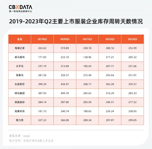 库存方面,绝大多数企业面临存货积压、存货周转速度慢的情况。根据各公司公告,相较于2021年同期,除报喜鸟和比音勒芬外,其他企业今年二季度的库存周转天数均有不同程度地延长,其中森马服饰更是增加了76.36天。