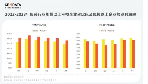 除此之外,疫情结束后,受需求端不景气的影响,服装企业运行承压,盈利难度大、库存积压等一系列亟待解决的问题变得愈发突出。国家统计局数据显示,今年每月行业规模以上企业亏损面在30%左右,每月亏损企业占比均高于去年同月。经营利润率方面,2023年规模以上企业的每月经营利润率都低于去年同期,并且2月-5月营业利润率不足4%。
