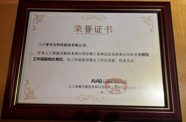 9月17日,2023南京人工智能产业发展大会上,三六零集团被授予人工智能重点实验室大模型工作组副组长单位,参与中国信通院大模型标准体系2.0的建设,助力中国大模型产业发展及落地。