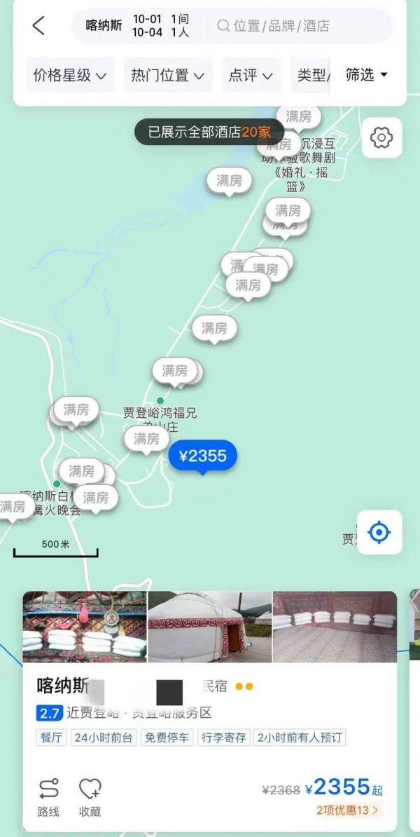 “打算9月中下旬去新疆,提前一个月开始订酒店,结果喀纳斯景区的民宿价格都在两三千一晚,而且很多还被订光了。包车也特别贵,7座商务车一天1700元。”肖晓说。