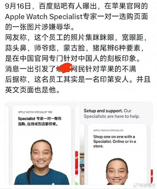 首先,苹果公司的举动让中国人感到愤怒。近期,苹苹果官网的Apple Watch Specialist专家一对一选购页面上的一张员工照片,似乎融合了多个中国人的刻板印象,从眯眯眼到蒙古脸,看似是对中国网友的刺激。争议立刻在社交媒体上传播,引发了广泛的愤怒和辩论,中国网民们对苹果公司的不满之情溢于言表。这种不尊重和忽视中国市场的做法,让许多中国人感到被冷落和不被重视。这种情绪的积累导致了中国人对苹果公司的不满和愤怒。