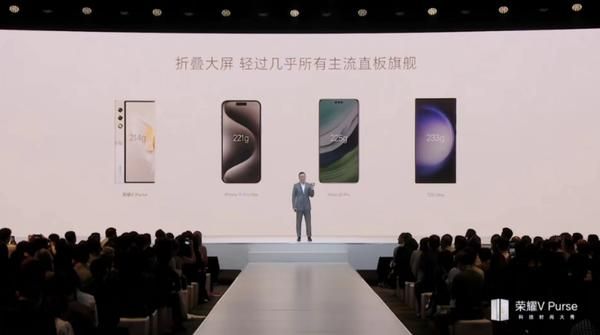 根据介绍,荣耀V Purse虽然是一款大折叠屏手机,但是在重量上,荣耀V Purse却只有214g,这个重量比目前几乎所有主流直板旗舰手机都要轻。在发布会上,赵明将荣耀V Purse和华为Mate60 Pro(225g)、苹果iPhone 15 Pro Max(221g)和三星S23 Ultra(233g)进行了对比。网友在弹幕中表示:“荣耀遥遥领先!”。