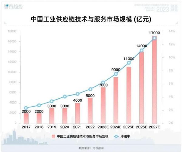 根据灼识咨询的报告,2022年,中国工业供应链技术与服务渗透率(定义为工业供应链技术与服务市场规模除以工业供应链市场规模)为5.2%,而美国的该渗透率约为15%。中国工业供应链技术与服务渗透率预计于2027年将大幅增至12.9%。
