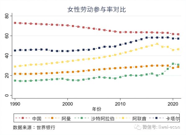 女性劳动参与率指女性就业者及失业者占该国家或地区15-64岁女性人口的比例。