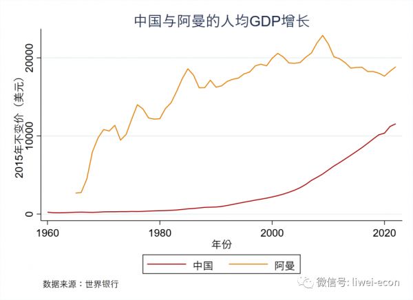 从GDP增长看,根据世界银行公布的2015年不变价美元数据计算,1965年阿曼的GDP为16亿美元,而2022年这一指标已膨胀至862.9亿,后者是前者的54倍;对照中国改革开放以来,在相同的口径下,1978年中国的GDP为3644亿美元,而2022年这一指标已膨胀至163252亿美元,后者是前者的约45倍。