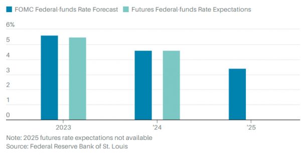 FOMC和期货市场的预测显示,明年联邦基金利率将下降,前提是通胀和经济继续放缓,但利率可能将在更长时间内保持在更高的水平。