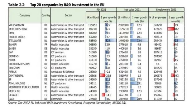 2022年12月15日,欧盟委员会公布“工业研发投资全球排行榜”,分析了2021年全球研发投入最大的2500家公司。这些公司的总部分布在41个国家,在世界各地拥有超过90万家子公司,每家公司在2021年的研发投入超过4850万欧元。
