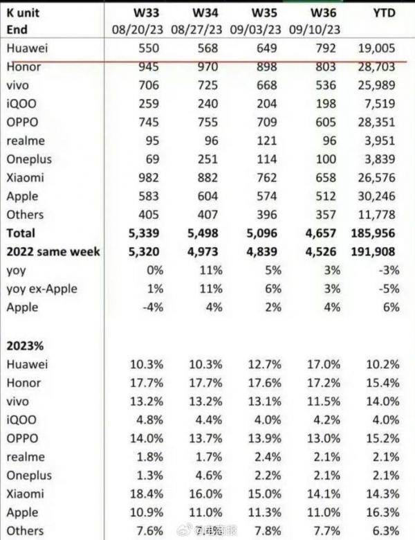 消息称华为上上周拿下中国智能手机市场第二,销量占比达 17%