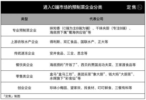 加入C端预制菜大军的,包括味知香这样的专业预制菜公司,得利斯这样的水产公司,三全、思念等传统速冻企业,还有离消费者最近的餐饮连锁,如海底捞、西贝等,零售类玩家如盒马、永辉、美团买菜等,以及一大批创业公司。