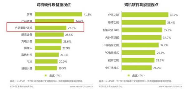 根据艾瑞咨询的调查,从消费者的需求来看,用户在购机时硬件层面的关注点中,除了屏幕和产品质量这两个基础体验要素,产品重量和外观是最被大家所重视的。