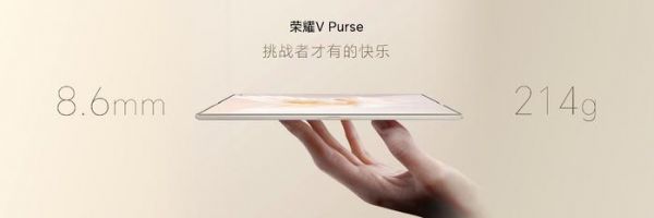 今年 7 月推出的荣耀 Magic V2,闭合态厚度仅有 9.9mm,这种轻薄无异于打开了折叠屏的新时代。时隔 60 多天后,荣耀又推出了全新的荣耀 V Purse,闭合状态厚度仅为 8.6mm,展开状态厚度 4.3mm,整机重量仅有 214g,再次刷新已有折叠屏轻薄纪录。