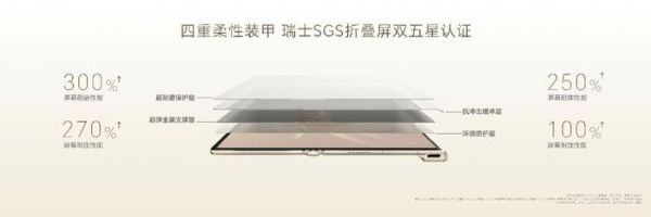 当然,荣耀 V Purse 不仅要考虑轻薄,还兼顾耐用性。荣耀 V Purse 针对屏幕耐久度,带来了由保护层、缓冲层、支撑层和防护层共同构成的“四重柔性装甲”解决方案,相较于已经发布的折叠屏,屏幕耐磨性能提升 300%。荣耀 V Purse 还获得了瑞士 SGS 折叠屏双五星认证,可靠性全面领先。