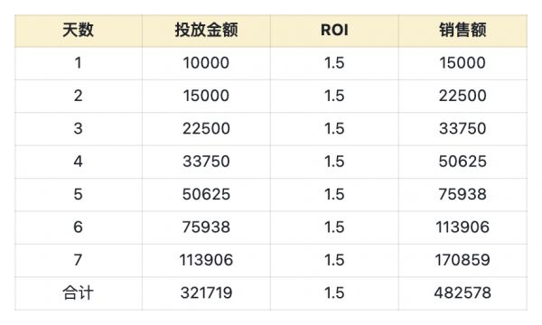 滚雪球的速度,取决于ROI为正的效率,比如当天投1万,当天就能收回1.5万,那么理论上第二天就能有1.5万的投放预算,同时第二天保持转化率后,第二天又继续收回2.25万。按照这个原则,只需要7天,第一天只需要投入1万的金额,7天之后,每天的销售额就能实现17万,而且一周产生的销售额就能达到48万,利润16万,这就是投放杠杆的魅力。