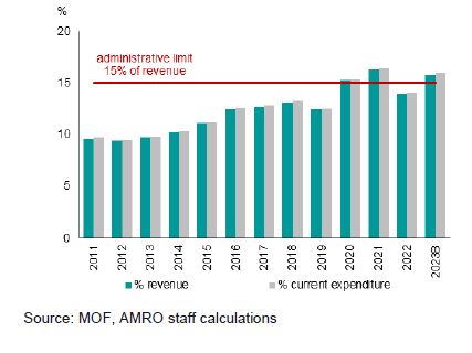 在政府财政方面,由于以燃油补贴为主的各项社会福利因全球通胀使政府的开支成倍增加(如图4),联邦政府债务已经处于GDP的60%左右(如图5),更为严峻的是,因为利率的提升,使其每年的债务还本付息的负担已经超过收入15%的限制(如图6)。