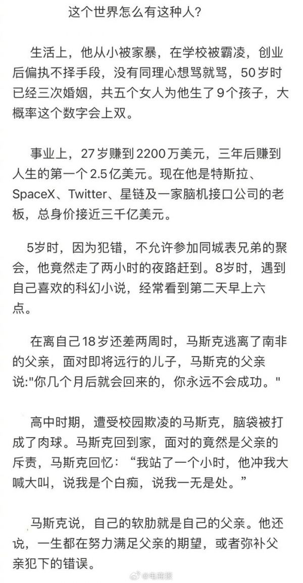 网址: 首富马斯克的悲惨童年,网友感慨:他最终成为了自己讨厌的样子 http://www.xishuta.cn/newsview91401.html