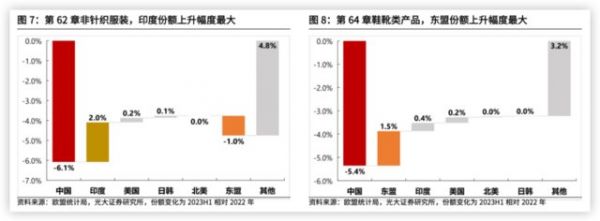 1)纺织鞋靴类:份额替代较为分散,纺服类产品中印度份额上升最多,东盟份额有所下降;鞋靴类产品中东盟份额上升最多。