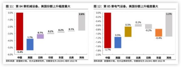 一是欧盟自美国进口机电设备以及轻工制品的份额虽有所上升,但更多呈现出与我国类似的均值回归态势,并未显著高于2019年水平(此前美国份额基本保持稳定),表明短期内美国份额上升的主要驱动力,更可能是美国供应链的逐步修复;